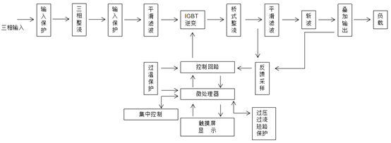 三相交流电经EMI滤波器滤波后,由整流桥模块整流,再经电容滤波,由IGBT构成的桥式逆变电路,该直流高压经逆变电路逆变为脉宽按正弦波规律变化的高频脉冲波,经变压器升压(或降压),得到高压(或低压)高频脉冲波,再经过整流桥整流,得到高压(或低压)直流,最后经IGBT斩波,输出单极性脉冲波