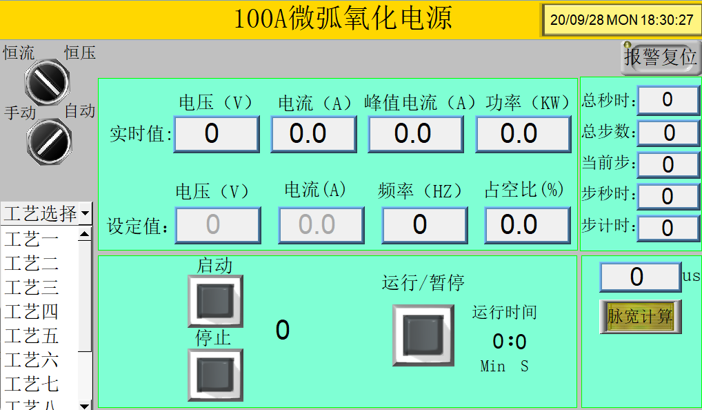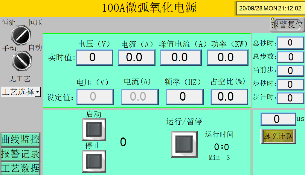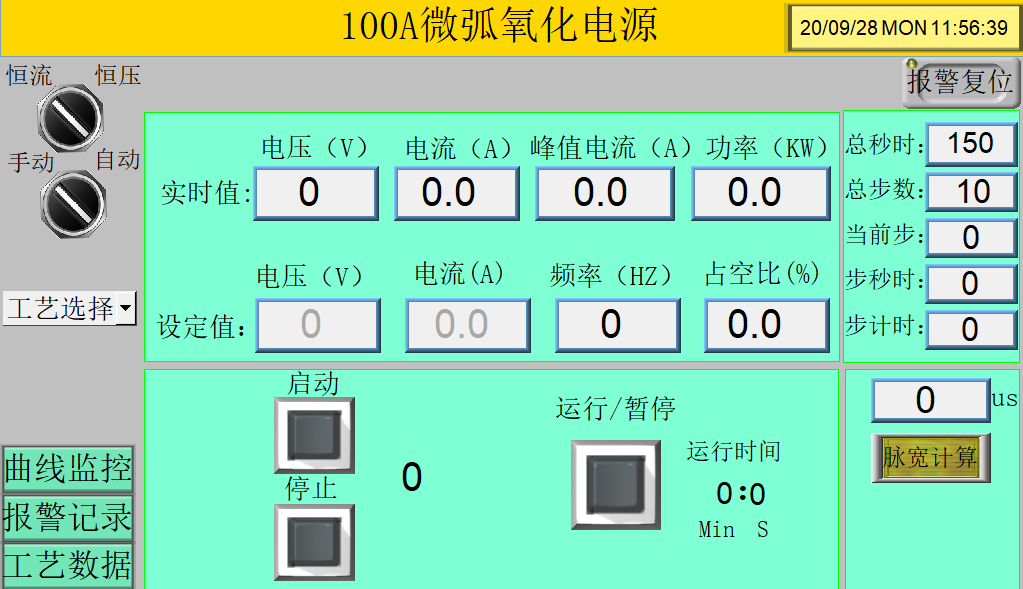 (1)、设定好手动、恒压控制模式后,可在“设定值:”区间内设置“电压”、“频率”、“占空比”参数(此时“电流”设定区间为无法操作区),点击“脉宽计算”模拟按钮可以显示当前设置的“频率”、“占空比”条件下的“脉宽”(单位为us)。检查设置参数无误后,点击“启动”按钮,点击后电源三相电接触器吸合(可以听见一“啪”响),右侧计数器开始倒计时10秒,10秒后电源前级接触器吸合(可以再听见一声“啪”响),两个接触器均吸合后,可见启动状态绿灯亮起,表示电源已处于启动状态,此时再点击“运行/暂停”模拟按钮时电源即按设定参数输出运行,“实时值:”区间显示各设置参数的实时反馈值。“运行/暂停”模拟按钮右侧为记录运行时间。