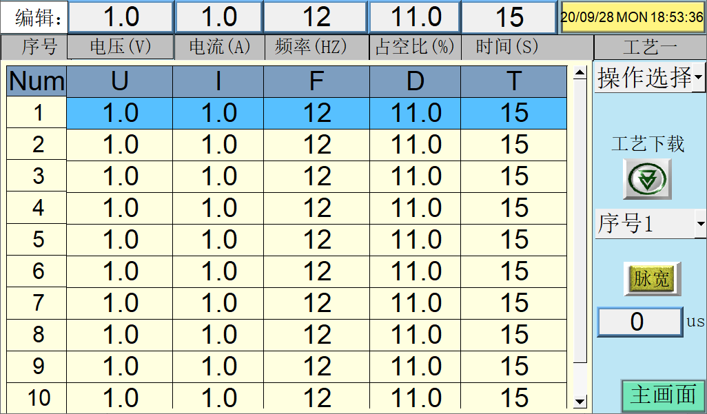 (2)、选择其中一套工艺后(以工艺一为例),进入工艺编辑界面。在此界面中可为该套工艺编辑10步工艺参数。此时顶行“编辑:”区间的“电压”为无法操作区。点击右下角“主画面”模拟按钮可以返回至操作界面。
