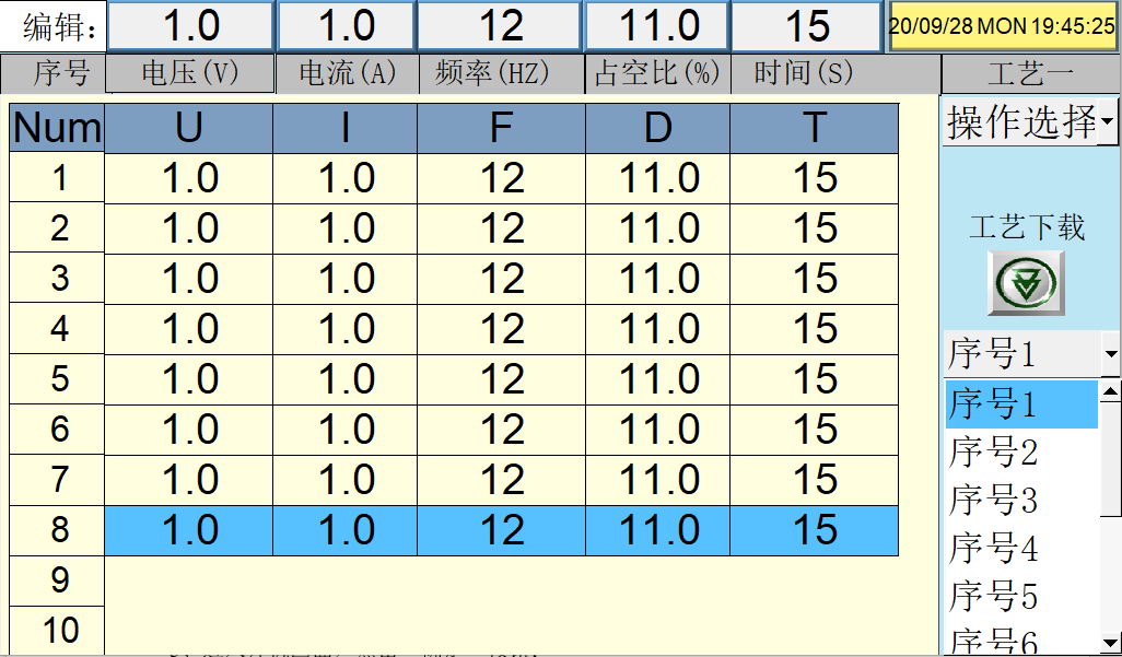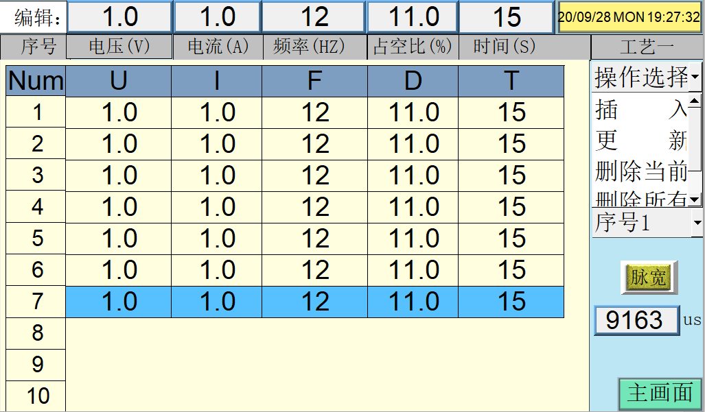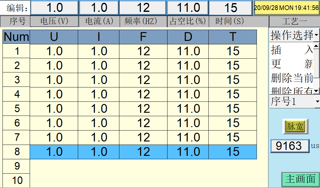 3、编辑工艺参数时,首先点选所要编辑(或修改)参数的目标步,被选中的目标步会显示蓝色,选中目标步后可在顶行“编辑:”区设置“电压”、“频率”、“占空比”、“时间(单位为s)”参数。检查设置参数无误后,点击“操作选择”下拉菜单选择“更新”,则将“编辑:”区编辑(或修改)的参数设置于目标步。